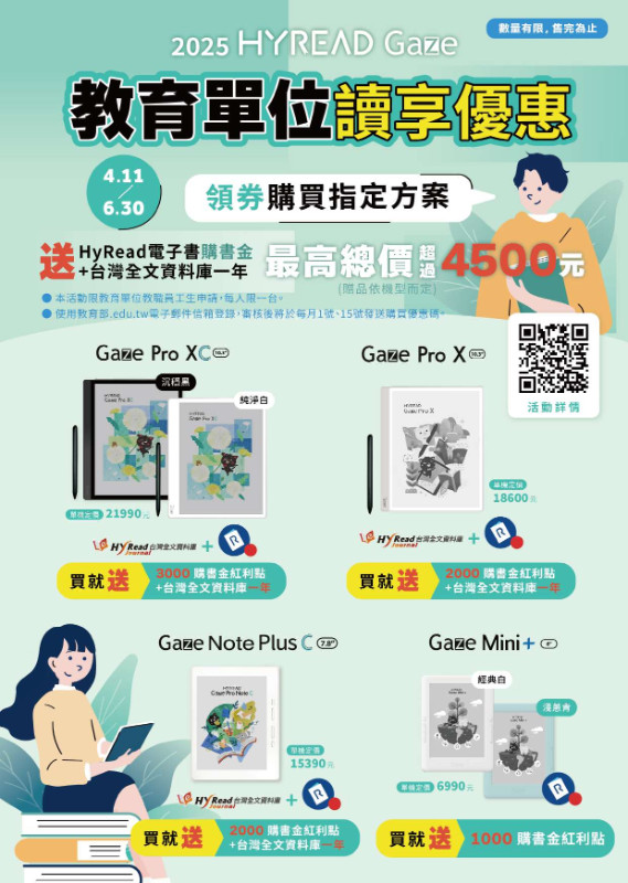 為響應數位學習趨勢,提供教育單位更優質的數位閱讀體驗,本公司特推出專為全國教育單位教職員生設計之「HyRead Gaze電子紙閱讀器」體驗優惠方案 |