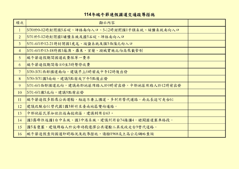 轉知: 114年端午節連假國道交通疏導措施