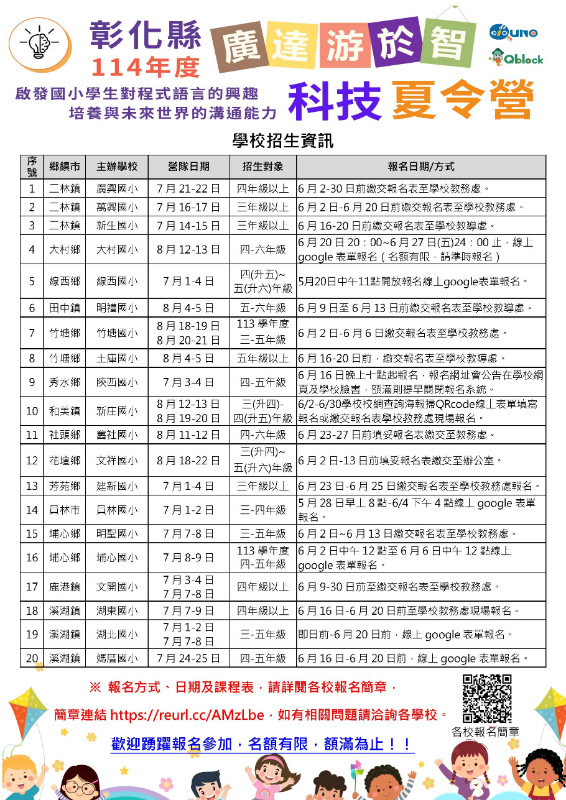 一、為向下扎根本縣國小學童之科技力,啟發其對程式語言之興趣,並培養未來世界之溝通能力,由本縣廣達游於智種子學校辦理科技夏令營。 營隊課程採用為國小學童量身打造之程式教具Quno與Qblock,協助學生學習未來最具通用性的語言,輕鬆有趣地打開通往元宇宙的大門,期使本縣學子度過充實且富有意義的暑假生活。 二、本營隊招生對象為本縣國小三至六年級學生(實際依各校招生簡章公告為準)。 三、活動時間為114年7月至8月,報名方式、課程表及相關資訊詳見各校招生簡章(網址:https://reurl.cc/AMzLbe)。如有疑問,請逕洽各主辦學校。 四、敬請貴校協助公告並轉知學生踴躍報名,名額有限,額滿為止。