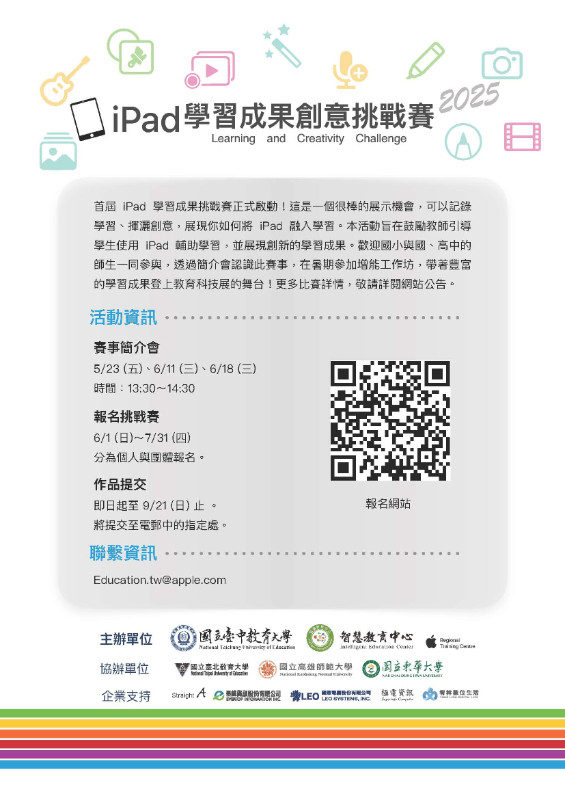 | 標題 | 轉知: 國立臺中教育大學辦理「2025年iPad學習成果創意挑戰賽」 |