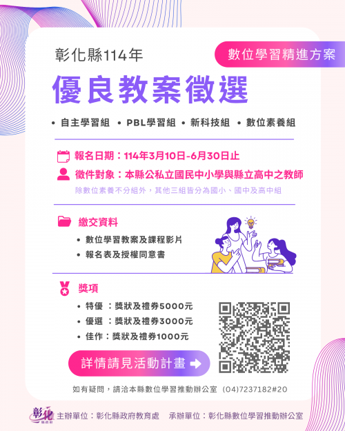 | 標題 | 轉知: 彰化縣政府 辦理「114年數位學習推動優良教學案例徵選實施計畫」,請踴躍參加。 |