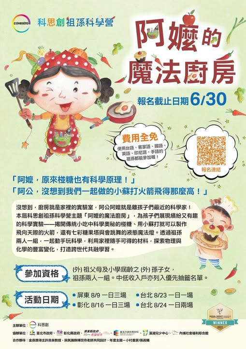 本府兒童青少年福利服務中心於114年8月16日(星期六)辦理「阿嬤的魔法廚房-祖孫科學營」,請貴校協助宣傳,請查照。 |