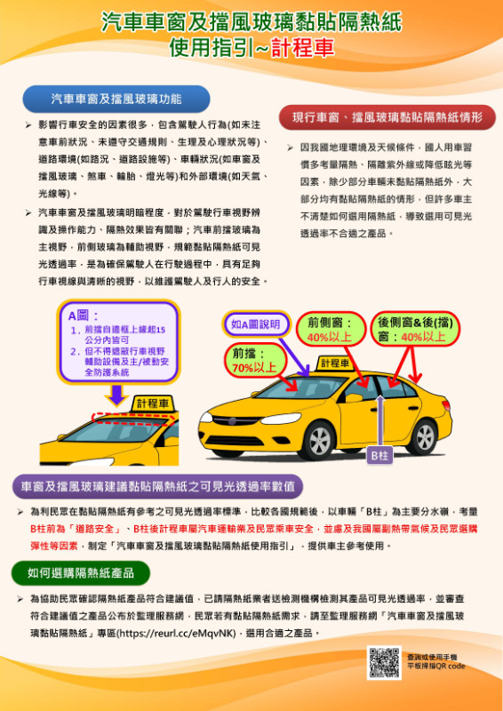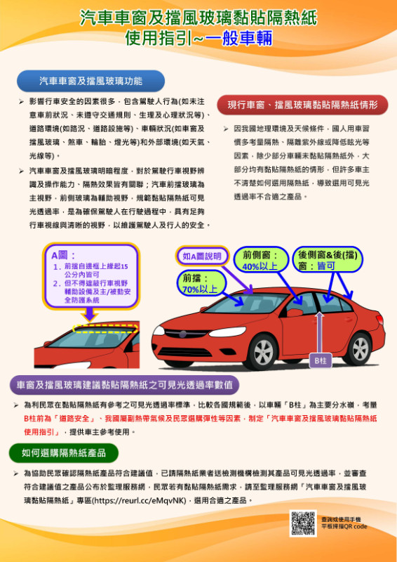 檢送本局114年6月30日以路監車字第1145013643號,公告訂定之「汽車車窗及擋風玻璃黏貼隔熱紙使用指引」1份,請協助轉知相關單位,本使用指引另載於監理服務網「汽車車窗及擋風玻璃黏貼隔熱紙」專區,請參考運用。