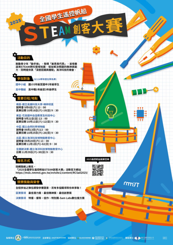 活動詳情與報名請參閱活動簡章,或至「2025全國學生遙控帆船STEAM創客大賽」活動官網https://mslc.nmmst.gov.tw/evtsite1/content/RCSail2025/ |