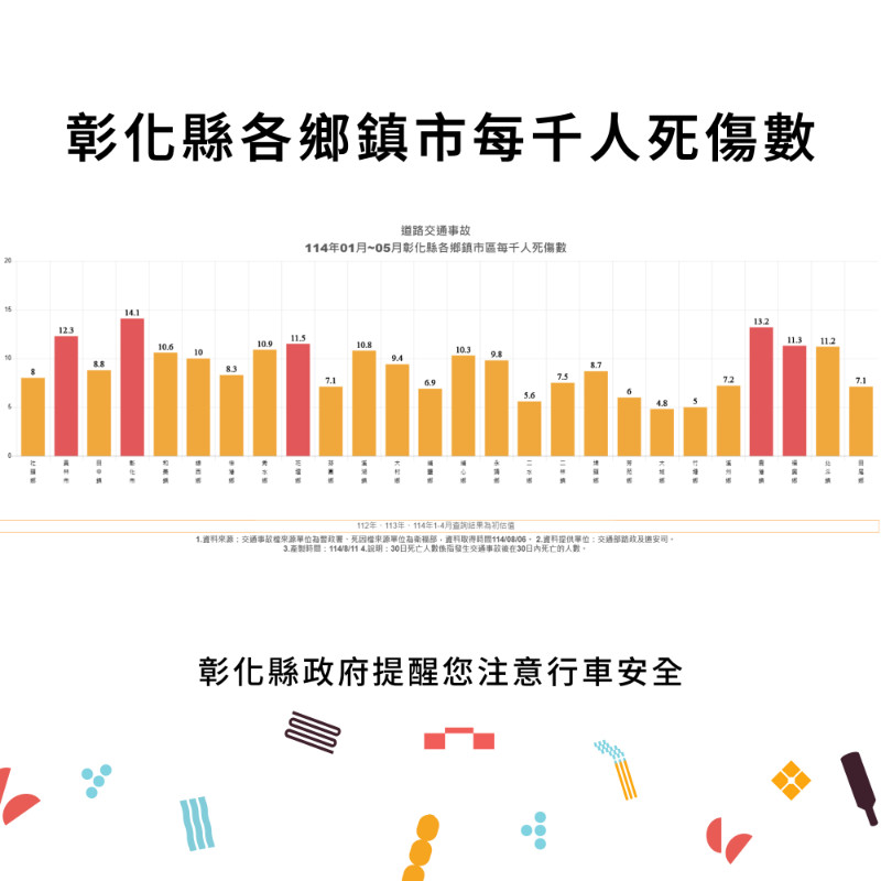 (一)114年1-5月道路交通事故死傷累計12,998人,行人請走行人穿越道,走對的路安全回家。 (二)戴上安全帽,雙手握車把,專心騎車才是最酷的模樣! (三)Drunk driving can result in not only a fine but also being deported. 根據交通部道安資訊查詢網統計快覽數據跟112年同期比較分析,以少年自行車騎士(含電自、電輔) 事故增加47.8%最高,外籍人士事故增加36.8%次之,高齡者行人(含代步車)增加30%再次之。1-5月份30日鄉鎮市每千人死傷人數於「彰化市、鹿港鎮、員林市」為多,肇事熱點以「彰化市」為多。 彰化縣政府關心您。
