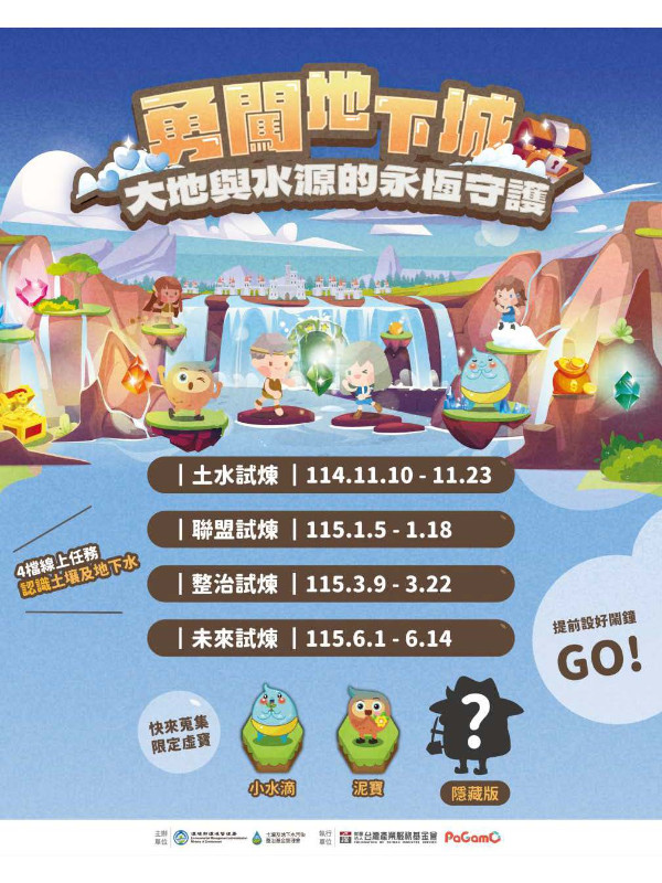 本線上學習活動搭配土壤及地下水的基本認知、污染成因、整治處理技術及永續利用等四大主題,共有四檔次任務時間(第一檔114年11月10日~11月23日、第二檔115年1月5日~1月18日、第三檔115年3月9日~3月22日及第四檔115年6月1日~6月14日),將依序上架於PaGamO遊戲平臺(即擁有PaGamO用戶之國小、國中及高中職均可遊玩)。 |