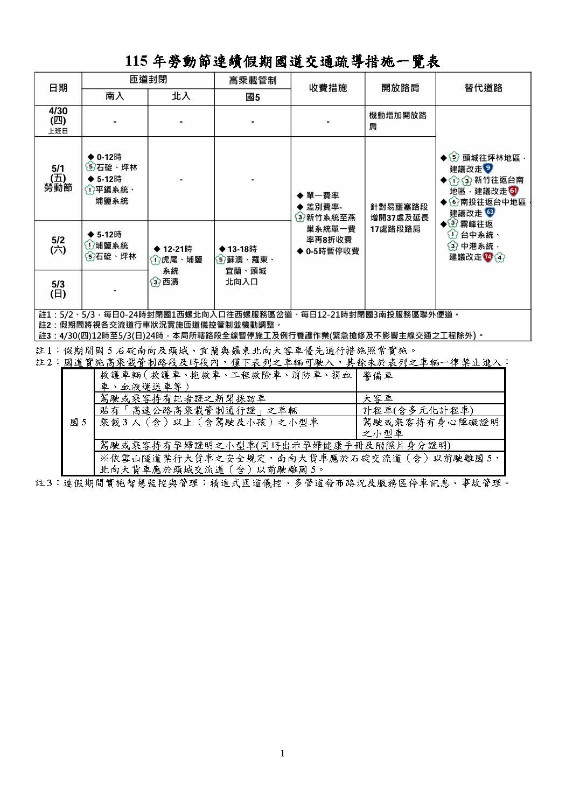 檢送交通部高速公路局「115年勞動節連續假期國道交通疏導措施一覽表