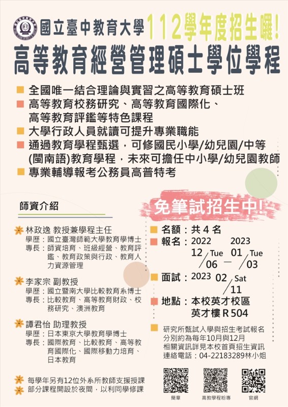 一、本校財金系EMBA實務與教學並重,校友傑出,是提升個人實力,擁有就業競爭力的最佳選擇,2023年展開璀璨的一頁,翻轉您的人生。二、112學年度碩士在職專班招生考試受理報名自即日起至112年2月2日(四)止。三、免筆試,採資料審查與面試,招生名額26名,具有工作經驗者不限年資即可報名。四、報考資料詳見本校招生簡章,簡章可至下列網址https://examweb.yuntech.edu.tw/WebExams/Exam_W/或【雲科首頁-招生資訊-碩士在職專班】免費下載列印或查詢。五、招生說明會:112年1月7日(六)中午12時(本校管院3樓MA307室)。說明會報名網址:https://reurl.cc/KXLnrM。六、本班假日上課為主,招生相關訊息請電洽雲科大財金系劉小姐05-5342601分機5403或E-mail:liuch@yuntech.edu.tw。