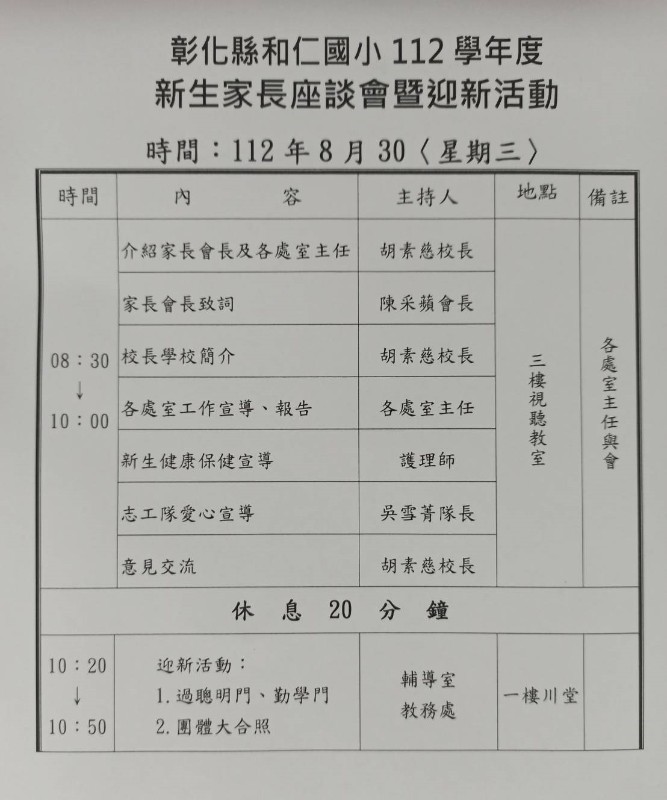 公告:112.08.30新生家長座談會暨迎新活動流程