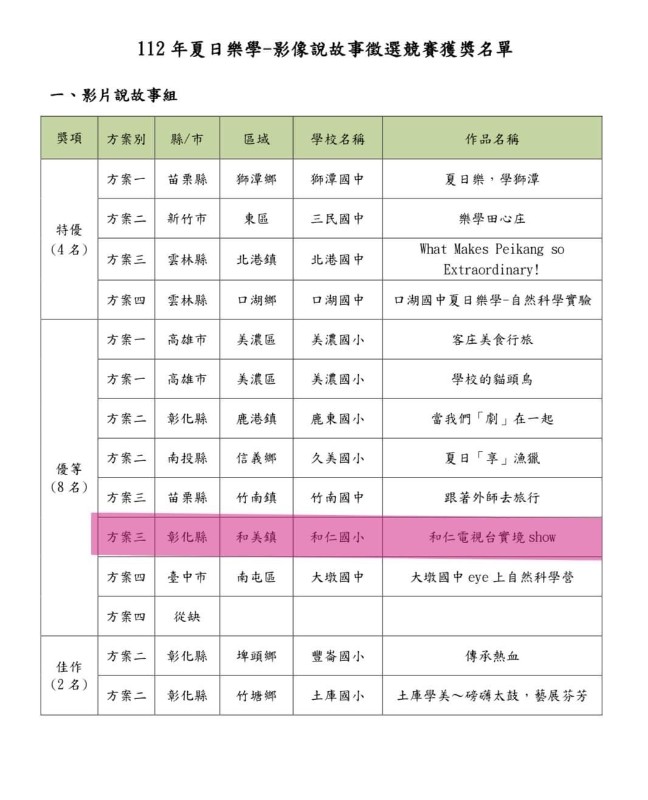 | 標題 | [榮譽事蹟公告]恭喜本校黃雅楨老師 參加112年夏日樂學-影像說故事徵選實施計畫 榮獲「影片說故事組」優等殊榮 |