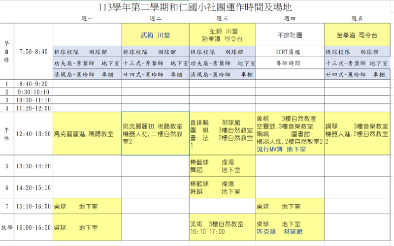 113學年下學期 113下和仁社團功課表 另外,下學期新增3個社團,每 和仁武術社介紹 ,每週二早上7:50~8:40 https://youtu.be/hNAYJS1w82g 和仁匹克球社介紹 ,每週四下午16:00~16:50 https://youtu.be/ix6yeO1GVIs 和仁流行MV舞社介紹,每週四中午12:40~13:30 https://youtu.be/9wHbG2huScU