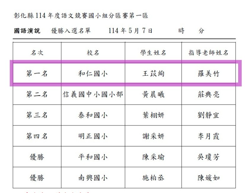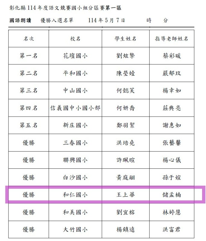 | 標題 | 【榮譽事蹟】本校學生參加彰化縣114年度語文競賽國小組分區賽成績優異 |