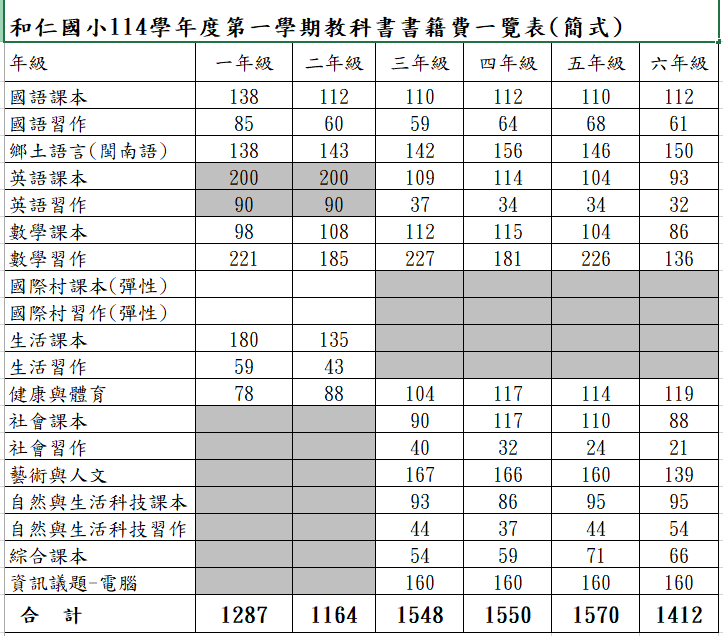 和仁國小114學年度第一學期教科書書籍費一覽表