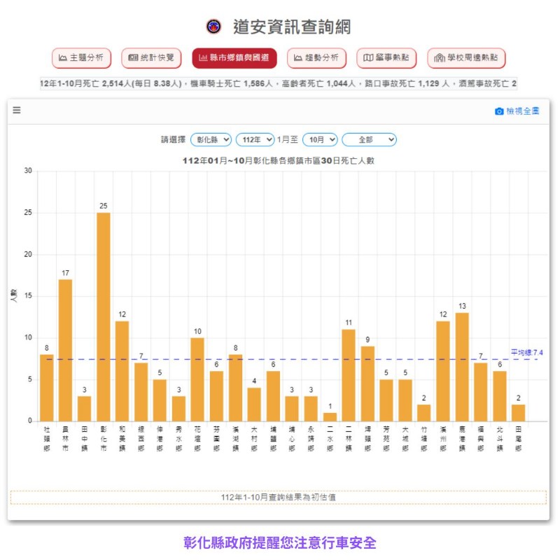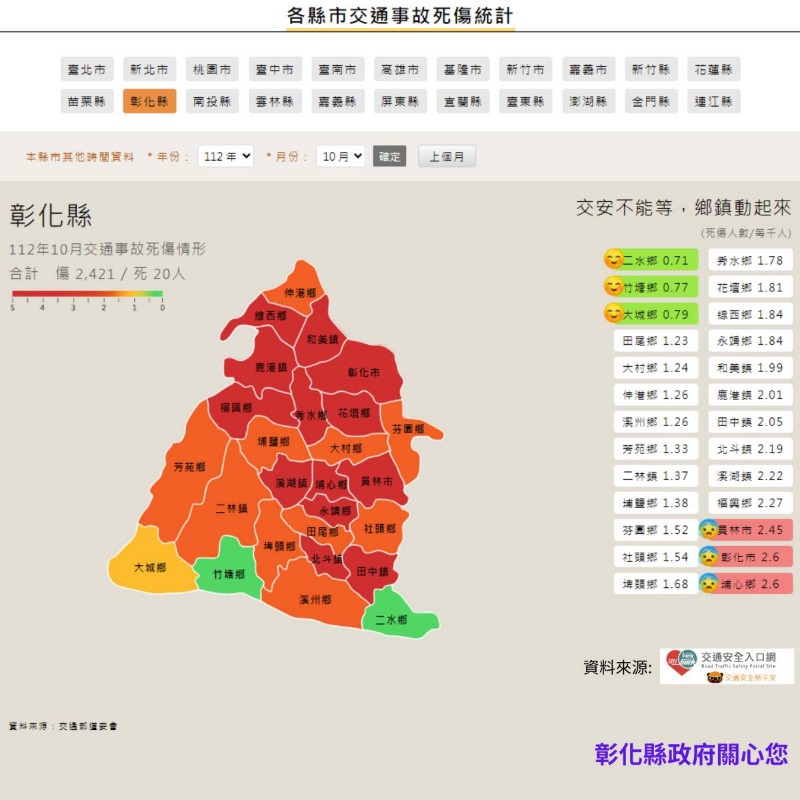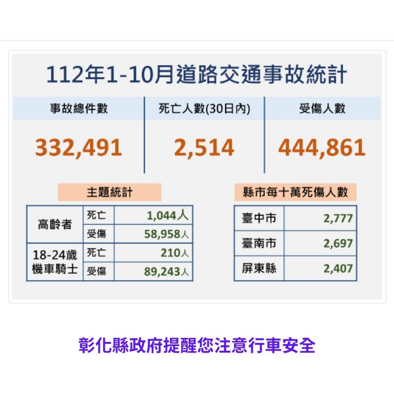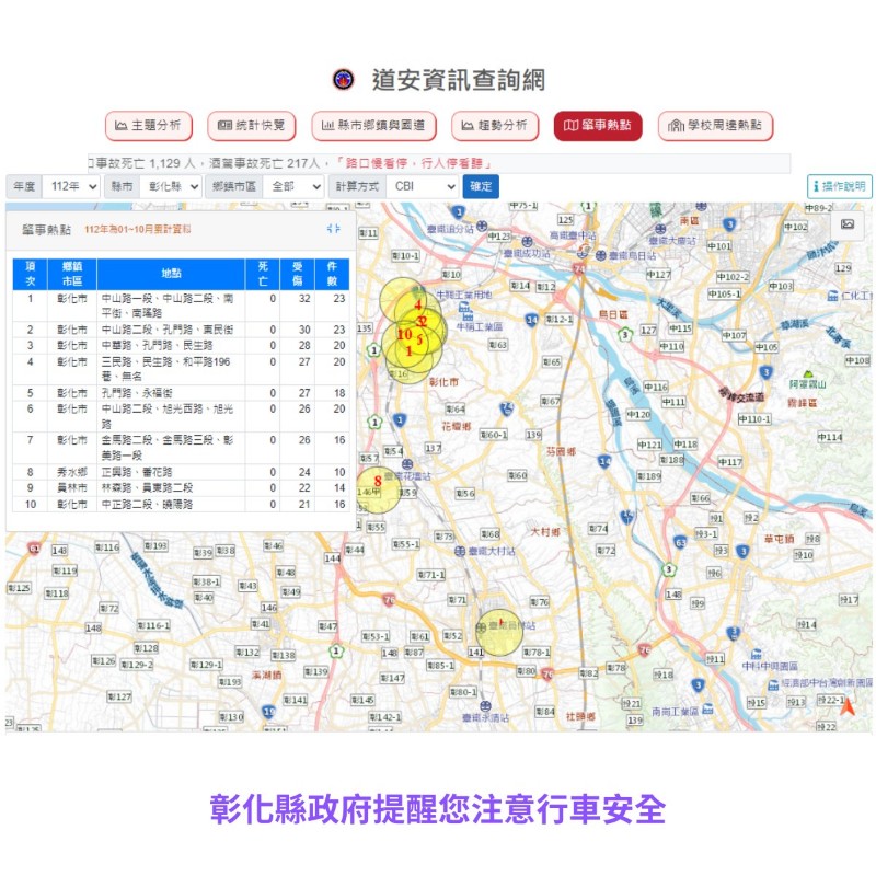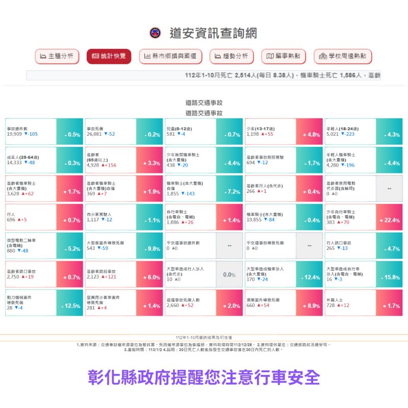 一、112年1-10月道路交通事故死傷累計26,081人,依道安資訊查詢網顯示跟去年同期比較,死傷人數當中少年自行車騎士增加22.4%,酒駕案件導致死傷增加8.9%。 二、跑馬資訊如下:(上刊期程即日起至1月31日止) 三、根據交通部道安資訊查詢網統計快覽數據跟去年同期比較分析,以少年(13-17歲)自行車騎士死傷最高,酒駕案件事故次之。1-10月30日死亡人數於「彰化市」、「員林市」、「鹿港鎮」為多, 10月死傷情形於「彰化市、員林市及埔心鄉」較多,另1-10月肇事熱點以「彰化市」為多,合先敘明。
