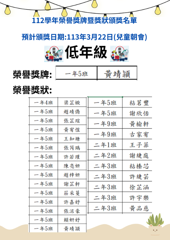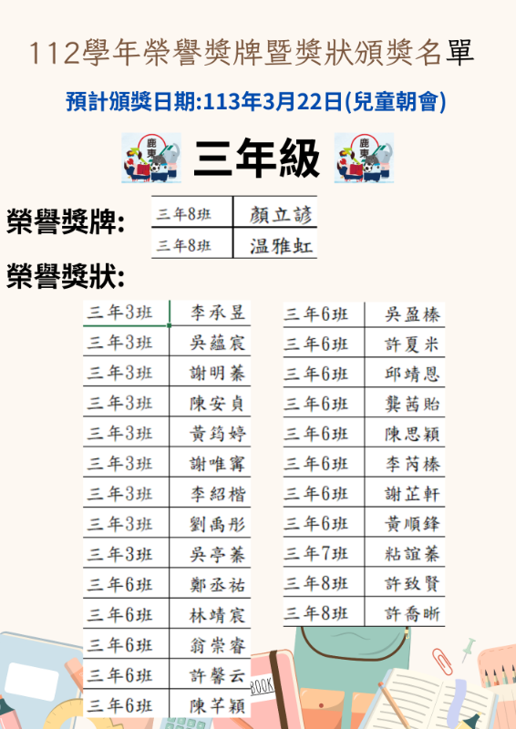 113年3月22日頒發校內榮譽銀牌暨榮譽獎狀名單