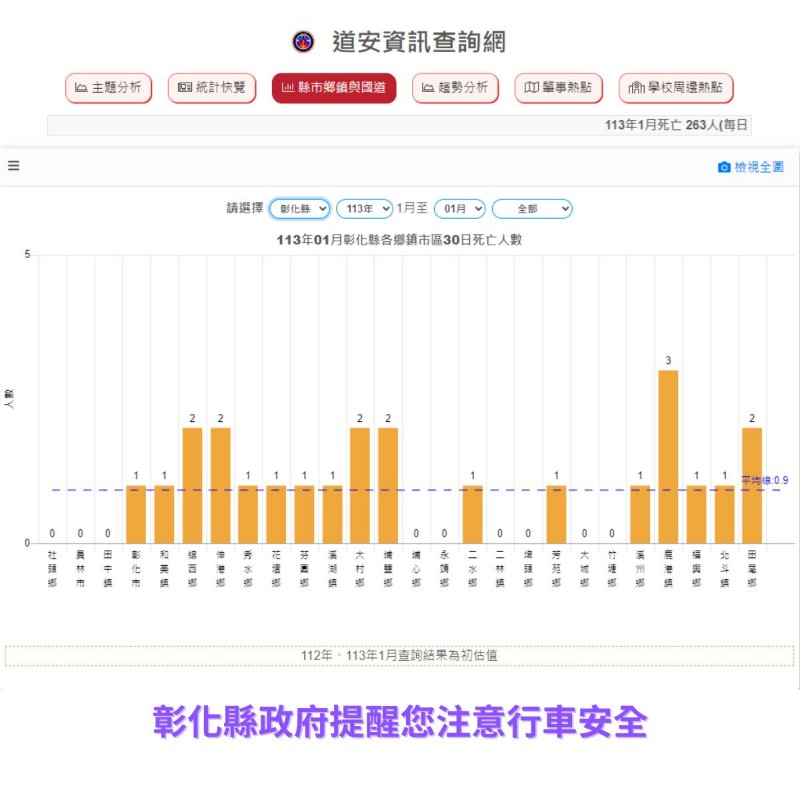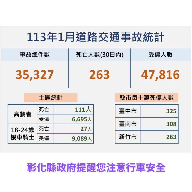 一、跑馬資訊如下:(上刊期程自即日起至4月30日止) 二、根據交通部道安資訊查詢網統計快覽數據跟去年同期比較分析,以大型車造成機車涉入(含大重機)死傷最高,高齡者機車騎士(含大重機)自撞案件事故次之。1月30日死亡人數於「鹿港鎮」為多,1月死傷情形於「北斗鎮、彰化市、鹿港鎮」較多,另1月肇事熱點以「彰化市」為多,合先敘明。 三、附件宣導圖為「113年1月交通事故死傷情形、鄉鎮市交通事故統計表、本縣各鄉鎮市30日死亡人數及事故與違規熱點」,社群宣導內容可參閱或分享「花現彰化-彰化縣政府新聞處」(https://reurl.cc/lg3mg9)臉書粉絲專頁。