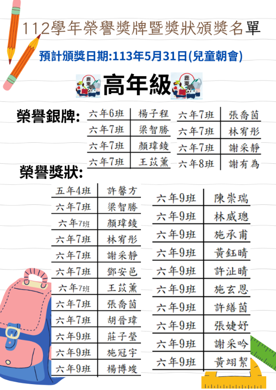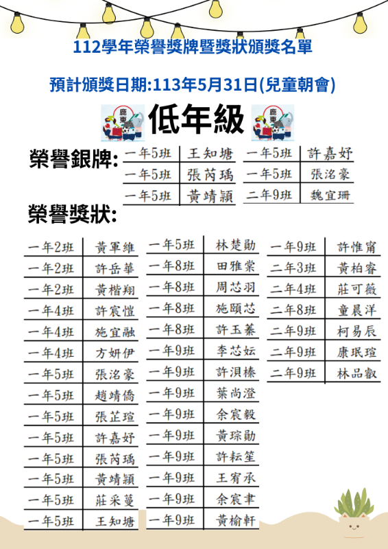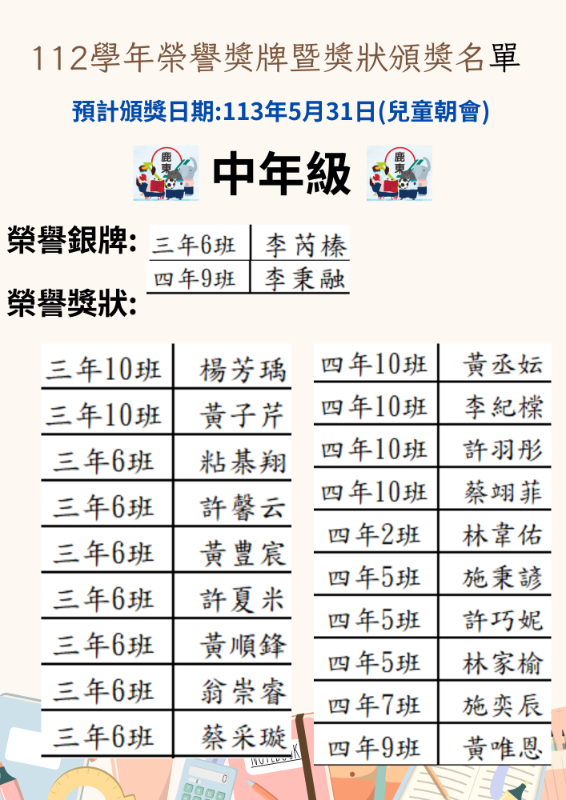 113年5月31日頒校內榮譽銀牌/獎狀名單