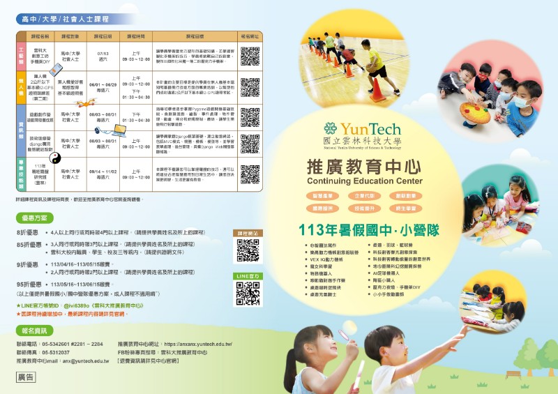 轉知國立雲林科技大學 推廣教育中心「2024年暑期國中、小培訓營」訊息。 |