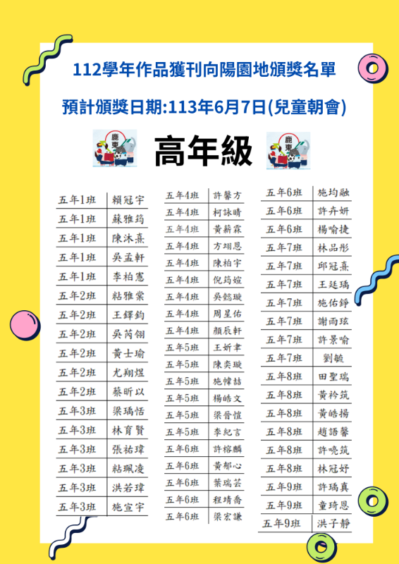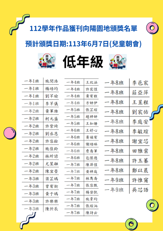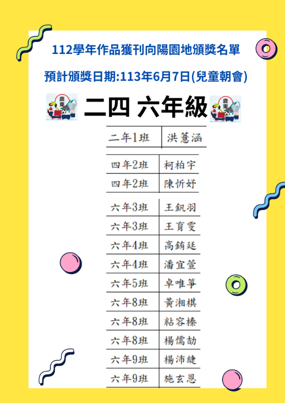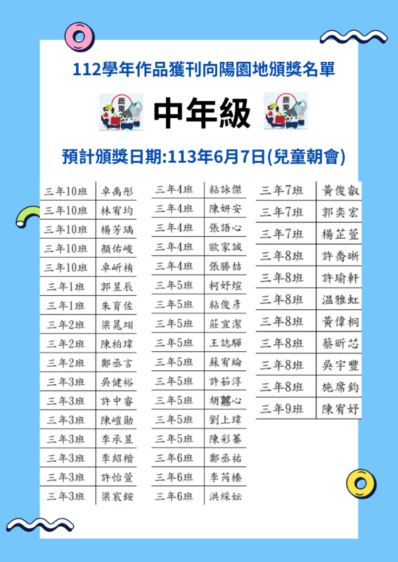 113年6月7日頒作品獲刊向陽園地(名單如附件)