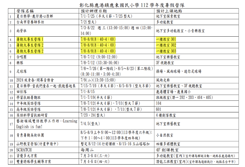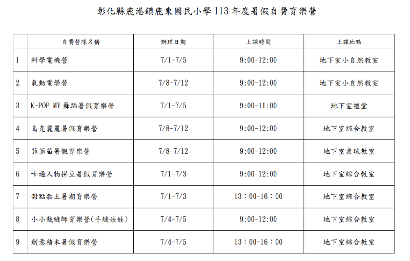 彰化縣鹿港鎮鹿東國民小學 112 學年度暑假營隊彙整表