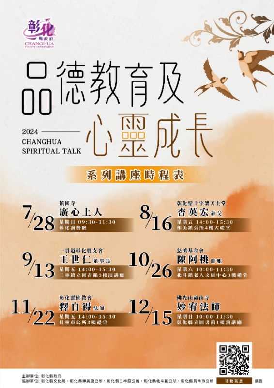 彰化縣政府辦理「彰化縣2024年品德教育及心靈成長系列講座」異動後文宣電子檔1份,請貴機關(學校)惠予協助於所屬網站重行更換公告宣傳,請查照。