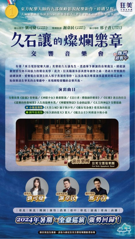 節目介紹:久石讓先生,身兼作曲家、指揮家、鋼琴家,及「吉卜力工作室」音樂總監的多重身分,透過筆下揮灑的音樂魔法,他總能在每部影像作品中,讓觀眾感受到不同張力的聲音美學,本節目中狂美精選多部久石讓先生歷年創作之最,盼與樂迷朋友在華美的音樂廳中,來場輝煌燦爛的音樂共振。 |