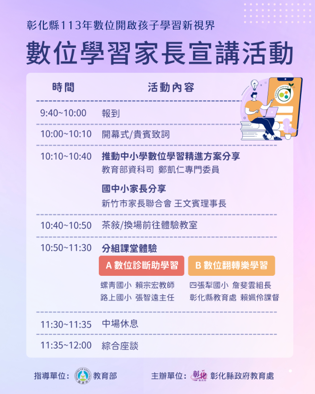 一、依據教育部核定「推動中小學數位學習精進方案」113年中小學實施計畫辦理。 二、為協助縣內中小學家長了解數位學習推動現況,與孩子一同迎向數位學習新時代,爰辦理因材網平臺家長體驗活動,推廣新型態教學的變化。 三、活動資訊: (一)活動名稱:113年數位開啟孩子學習新視界—數位學習家長宣講活動。 (二)辦理單位:教育部、彰化縣政府教育處。 (三)活動時間:113年10月12日(星期六)上午10時至12時。 (四)活動地點:鹿江國際中小學圖書館(彰化縣鹿港鎮自由路300號)。 (五)參加對象:彰化縣中小學家長,限額 60 名。 (六)報名方式:以線上表單方式報名(https://forms.gle/rewKBgCd5oC4R4Ur9),即日起至額滿為止。 四、當天09:00-12:00於學校活動中心亦辦理本縣數位教育創新成果發表會,歡迎各校家長共襄盛舉。 五、如有未盡事宜,請逕洽本縣數位學習推動辦公室04-7237182#20。