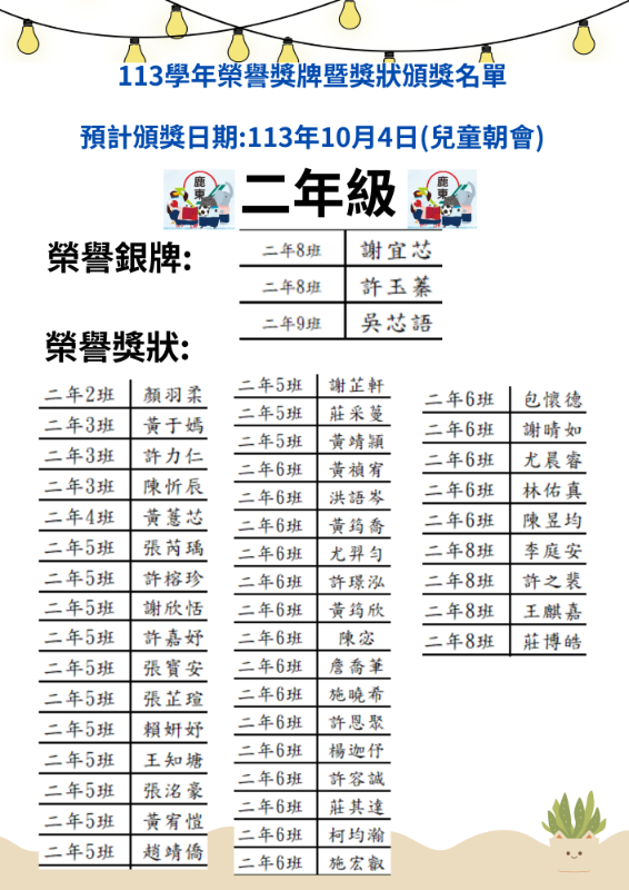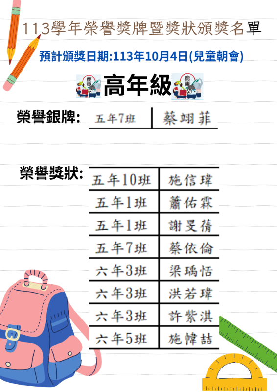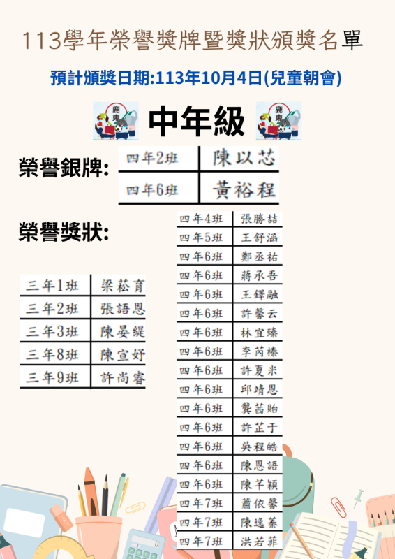 113年10月4日頒校內榮譽銀牌/獎狀名單