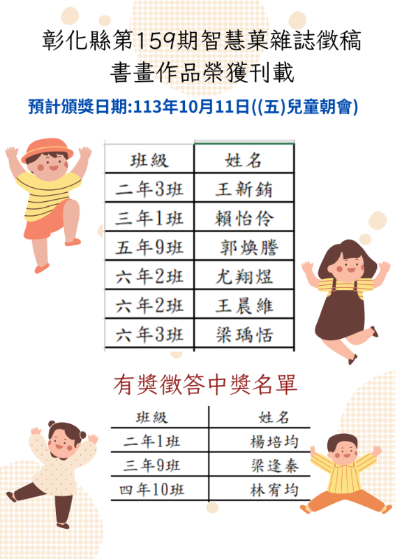 113年10月11日(五)兒童朝會頒作品獲刊第159期智慧菓雜誌名單