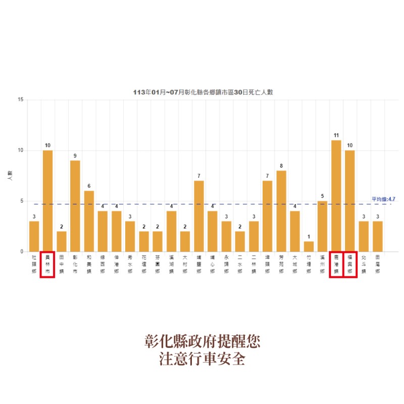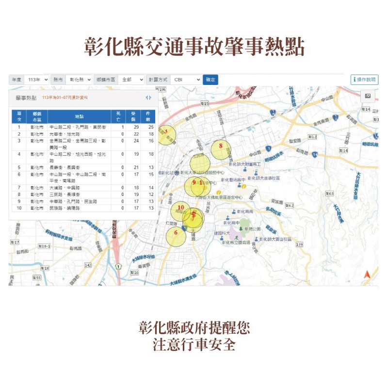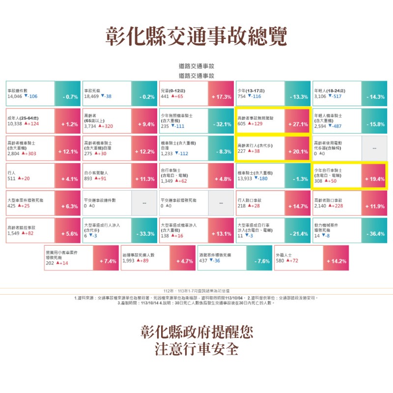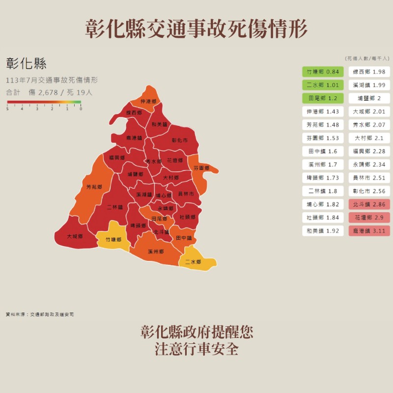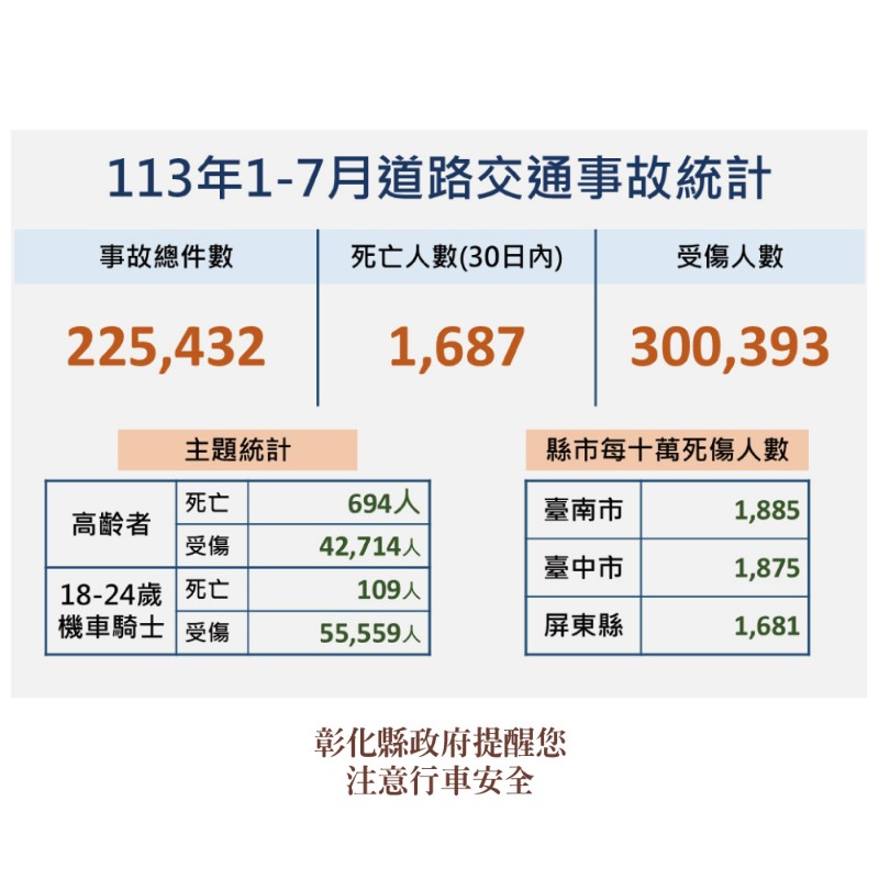 | 標題 | 彰化縣113年7月道路交通事故死傷累計18,469人,請大家共同遵守交通規則,共同降低死傷人數! |