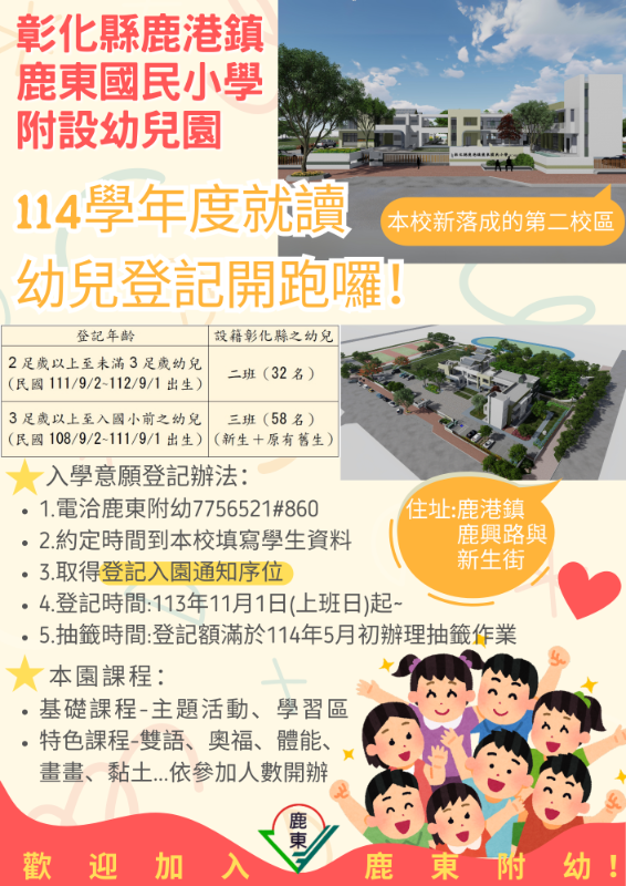 ★第二校區幼兒園新生登記★ 彰化縣鹿港鎮鹿東國民小學附設幼兒園 第二校區 114學年度就讀 幼兒登記開跑囉! 就讀地點:本校新落成的第二校區 就讀住址:鹿港鎮鹿興路與新生街