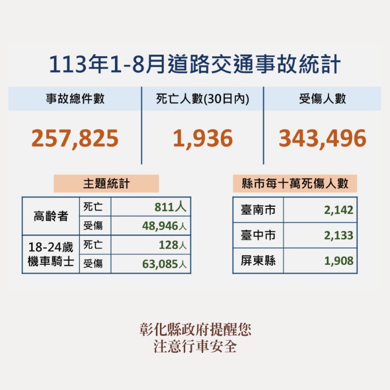 | 標題 | 彰化縣113年8月道路交通事故死傷累計21,009人,請大家共同遵守交通規則,共同降低死傷人數! |