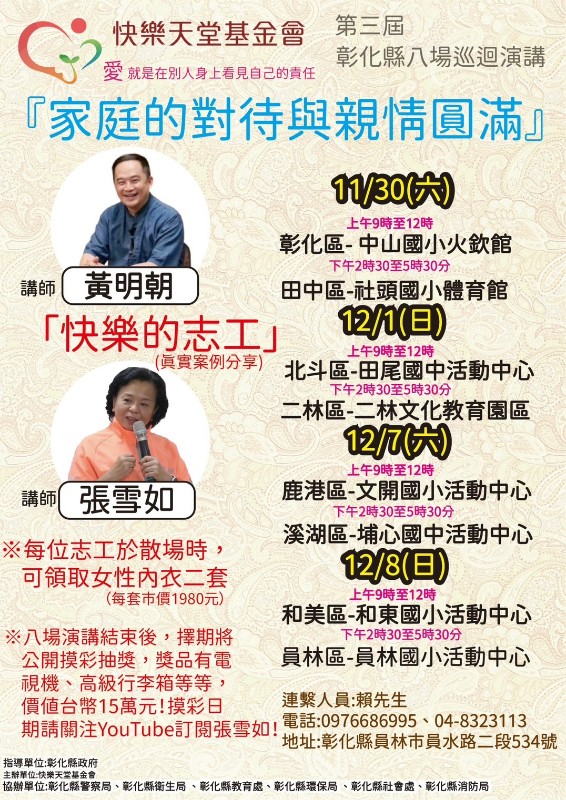 財團法人彰化縣私立快樂天堂社會福利慈善事業基金會辦理113年度彰化縣第3屆快樂的志工巡迴演講 「快樂天堂基金會」彰化縣八場巡迴演講 一.《場次時間地點》 11/30(六)彰化區(彰化、花壇、芬園) 11/30(六)田中區(田中、社頭、二水) 12/1(日)北斗區(北斗、田尾、溪洲、埤頭) 12/1(日) 二林區(二林、芳苑、竹塘、大城) 12/7(六)鹿港區(福興、鹿港、秀水) 12/7(六) 溪湖區(溪湖、埔鹽、埔心) 12/8(日)和美區(和美、線西、伸港) 12/8(日)員林區(員林、大村、永靖)