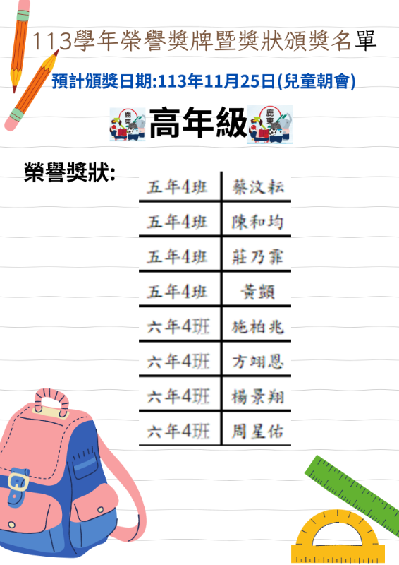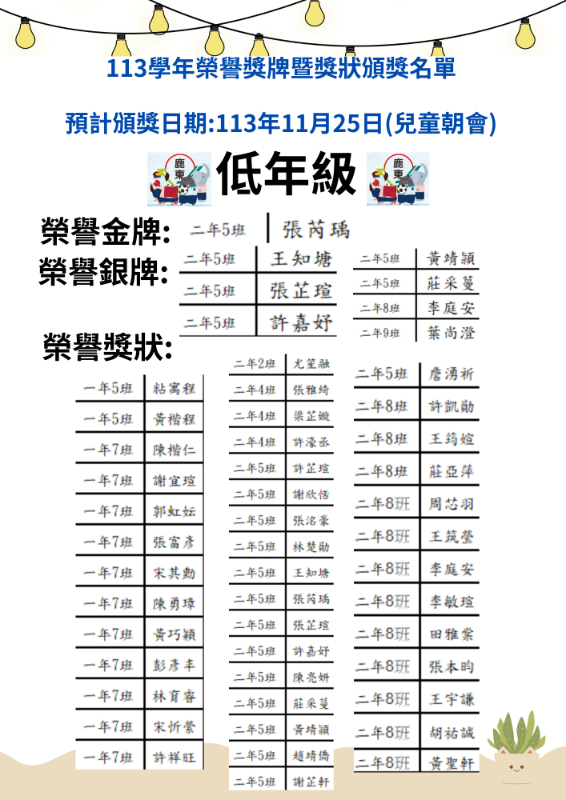 113年11月25日頒校內榮譽金牌/銀牌/獎狀名單
