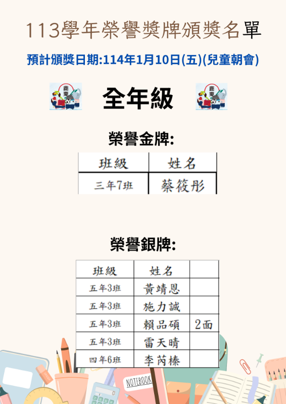 114年1月10日(五)預計表揚校內榮譽獎牌名單