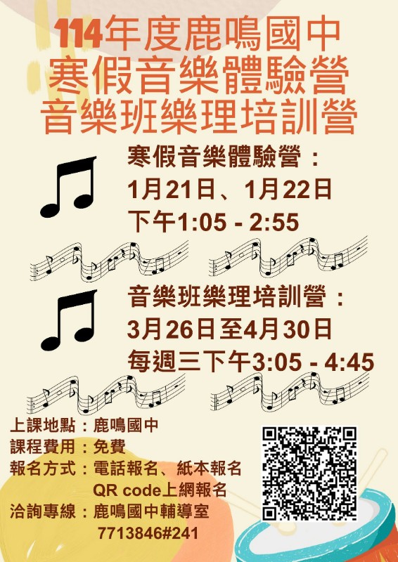 彰化縣立鹿鳴國民中學辦理114年度「寒假音樂體驗營」暨「音樂班樂理培訓營」活動海報乙份,內容多元豐富,全程免費,請學生踴躍參加。 |