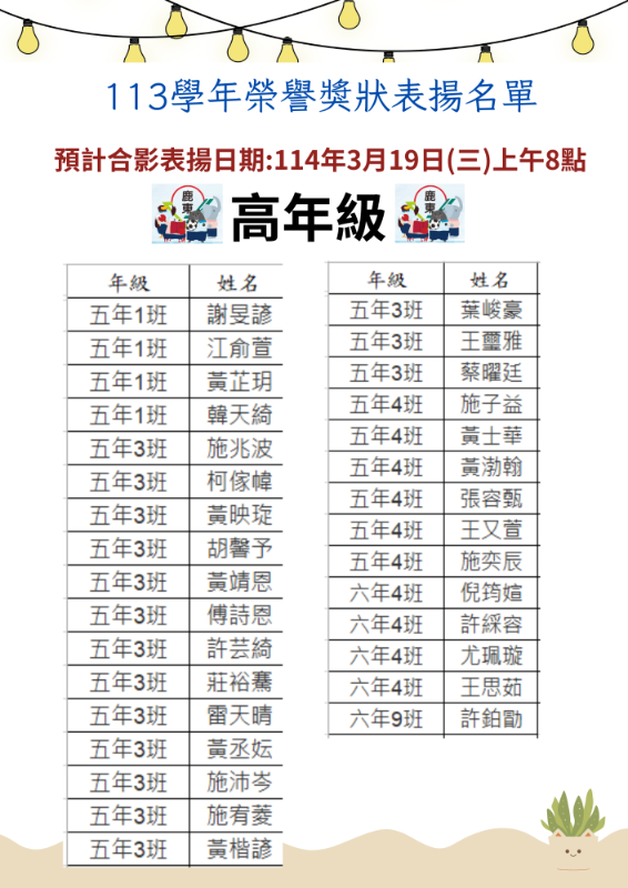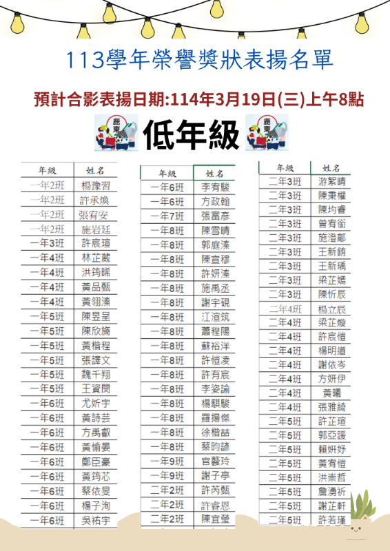 114年3月19日(三)預計表揚校內榮譽獎狀名單