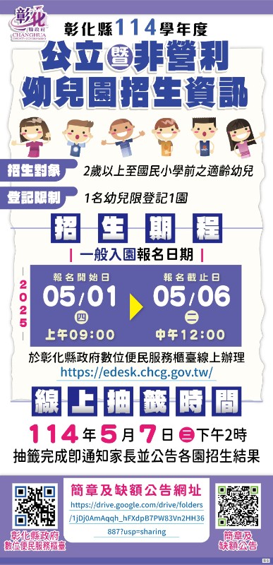 【鹿東附幼招生】5/1~6網路報名! 招收人數:2足歲幼幼專班26名、3至5足歲52名。(114學年度上學地點:鹿東第二校區) 時間:114年5月1日(四)9時起至114年5月6日(二)12時止 網址:彰化縣政府數位便民櫃臺網站(https://edesk.chcg.gov.tw/)「114年度彰化縣公立幼兒園及非營利幼兒園一般入園(非優先入園)招生登記」網站線上登記(https://edesk.chcg.gov.tw/eservice/apply_mode_list?searchText=%E5%B9%BC%E5%85%92),需填家長E-mail並上傳戶口名簿! 一般入園抽籤暨錄取名單公告時間:114年5月7日(三)14時,於前揭報名系統辦理線上抽籤,並立即公告各園錄、備取名單。 正取生錄取報到時間:114年5月8日(四)至114年5月13日(二)上班日親至幼兒園辦理,逾時未完成報到者視同放棄,並依序通知一般入園備取名冊幼兒家長依序遞補。 備取生報到時間:正取未報到之名額自114年5月14日(三)依序通知備取生親至幼兒園辦理報到。 幼兒就讀年齡: 二足歲:民國111年9月2日至民國112年9月1日出生幼兒。 三足歲:民國110年9月2日至民國111年9月1日出生幼兒。 四足歲:民國109年9月2日至民國110年9月1日出生幼兒。 五足歲:民國108年9月2日至民國109年9月1日出生幼兒。 ~鹿東附幼(04)7756521#860~歡迎您! *「鹿東附幼fb(https://www.facebook.com/LukangPreschool)」詳看最新消息!* ※報名請搜尋「彰化縣政府數位便民櫃臺」網站