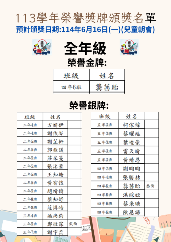 114年6月16日(一)預計表揚校內榮譽獎牌名單