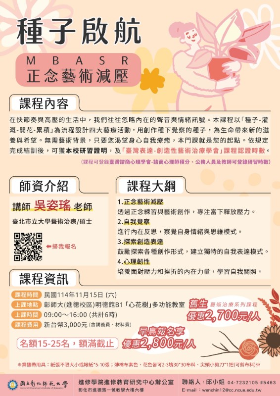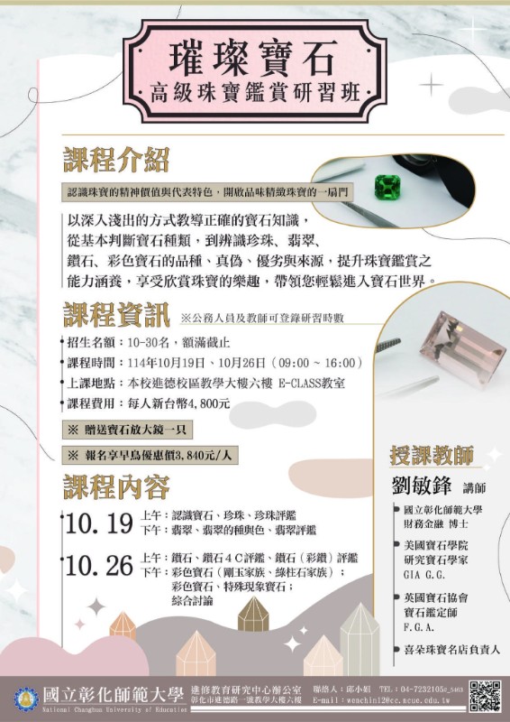 一、「【璀璨寶石】高級珠寶鑑賞研習班」 (一)課程特色:本課程邀請有美國G.I.A寶石學家﹑英國F.G.A寶石鑑定師資格的專業講師授課,從判斷寶石種類,提升珠寶鑑賞能力,具體學習到珍珠﹑翡翠﹑鑽石﹑彩色寶石的品種、真偽、優劣與來源。 (二)課程時間:114年10月19、26日,週日,9:00至16:00,共12時。 (三)課程費用:新台幣4800元,報名享早鳥價新台幣3840元。贈送寶石放大鏡一只。 二、「114年臺灣台語認證基礎班-台羅拼音」 (一)課程特色:用18小時學習臺灣台語-台羅拼音!由通過臺灣台語認證專業講師授課,系統性介紹臺灣台語的基本音韻系統,包括聲母、韻母、聲調與連讀音變,透過拼音和實作練習達到雙倍學習效果。 (二)課程時間:114年11月8日至11月22日,週六,9:00至16:00,3天合計共18小時,公務人員及教師可登錄研習時數。 (三)課程費用: 1、實體課程研習費用新台幣3100元。 2、線上課程研習費用新台幣2800元,講義資料將於課程前一周郵寄。 3、10/15前報名享早鳥價新台幣2800元,兩人以上同行每人享優惠2800 元,此優惠方案僅能二選一。 三、「種子啟航:MBASR正念藝術減壓」 (一)課程特色:以「種子-灌溉-開花-累積」為流程設計四大藝療活動,透過正念的專注力結合藝術創作的自由表達,開啟一場療癒與自我探索的旅程。 (二)課程時間:民國114年11月15日,週六,9:00至16:00,共計6時(可登錄臺灣諮商心理學會諮商心理師積分;公務人員及教師可登錄研習時數)。 (三)課程費用:新台幣3000元,含講義費、材料費。報名享早鳥優惠新台幣2800元;藝術治療系列課程舊生優惠新台幣2700元,報名時須備註。 四、報名步驟:線上報名,請至本校進修學院報名管理系統報名。如第一次報名, 請先申請帳號。(https://aps.ncue.edu.tw/cee/index.php)