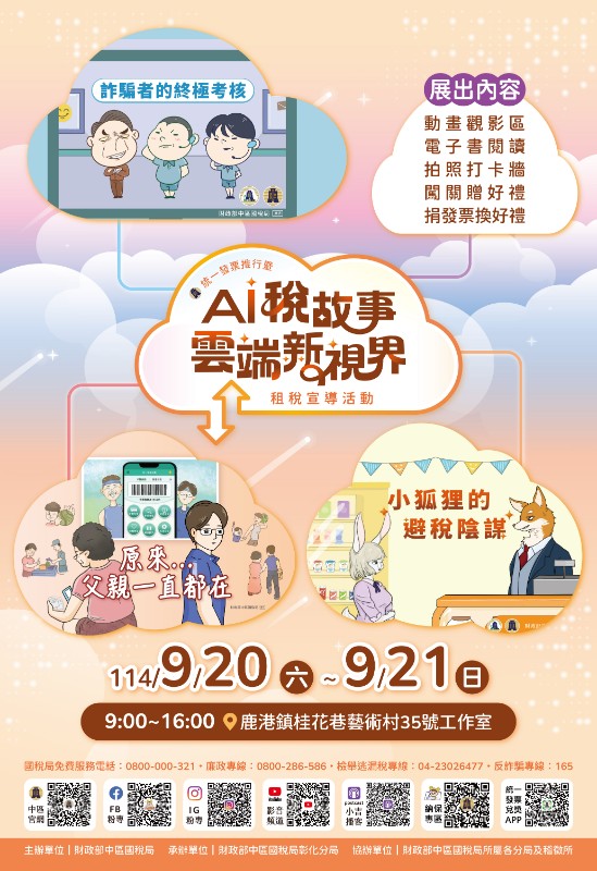 114年度統一發票推行暨「AI稅故事 雲端新視界」租稅宣導活動,展出地點:鹿港鎮桂花巷藝術村35號工作室。 |