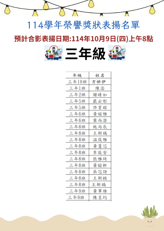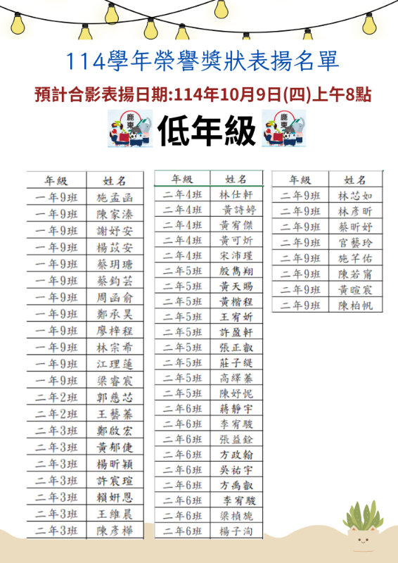 114年10月9日(四)預計表揚校內榮譽獎狀名單