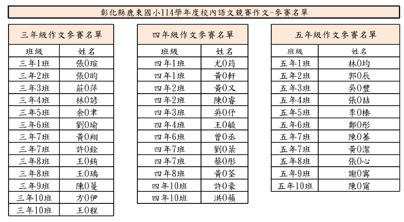 114校內語文競賽書寫類參賽名單及口說類出場序名單 一二三四五年級國語朗讀出場序名單 附件: