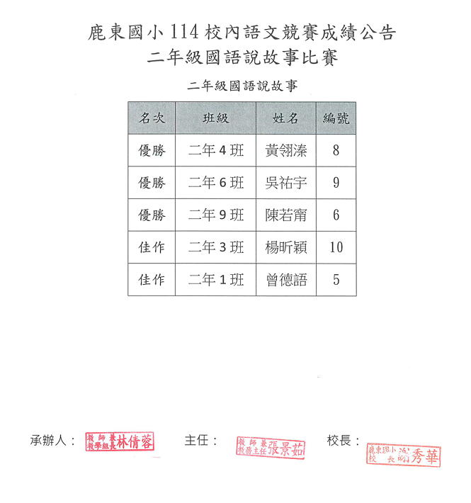 114校內語文競賽成績公告-二年級國語說故事比賽