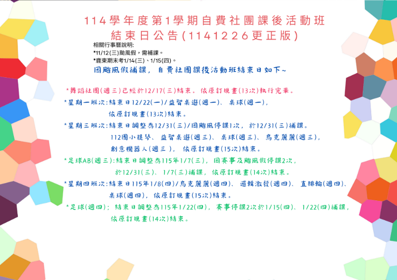 | 標題 | 本學期(114學年度第1學期)放學後自費社團課後活動班結束日公告(114年12月26日修正),煩請家長查閱。 |