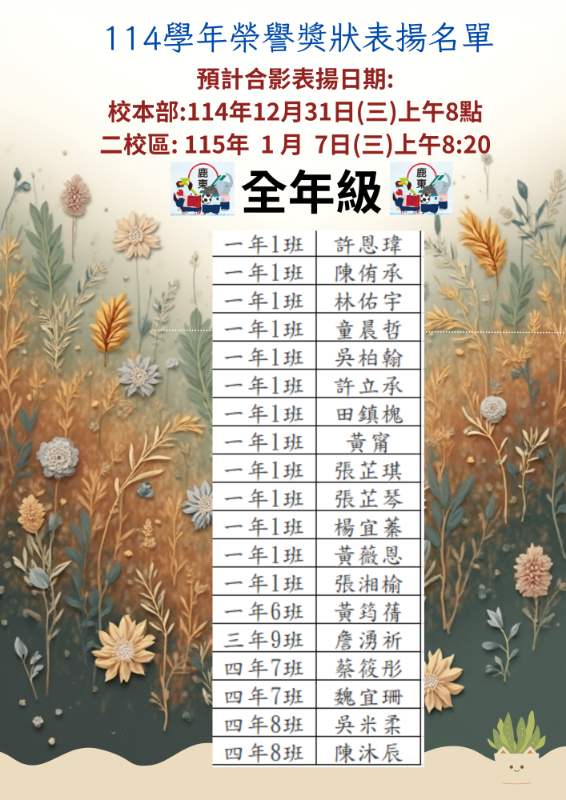 114年12月31日(三)預計表揚校內榮譽獎狀名單