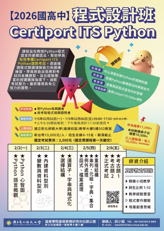 轉知:國立彰化師範大學進修學院推廣教育「【2026國高中程式語言】Certiport ITS Python程式設計班」、「日語會話五十音基礎班」、「日語N3中級Ⅱ班」招生簡章。