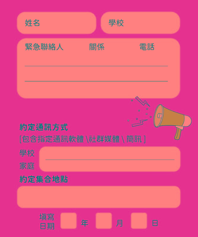 (1)學校欄位:學校於災害發生時通知家長之約定通訊方式,該約定方式應請學校統一制定,俾對外通知家長,其中包含採用何種通訊軟體,以及設定通訊軟體群組,於家長群組統一公告(班級群組或是全校對外官方帳號),或以簡訊、社群媒體等多元方式告知家長。 (2)家庭欄位:學生本人在災害發生時聯繫家長之約定通訊方式,如網路暢通時,可採用通訊軟體;如網路不暢通時,可採簡訊等方式聯繫。約定集合場所(地點)以因應地震災害為主,得依在地化災害特性填寫或增列。
